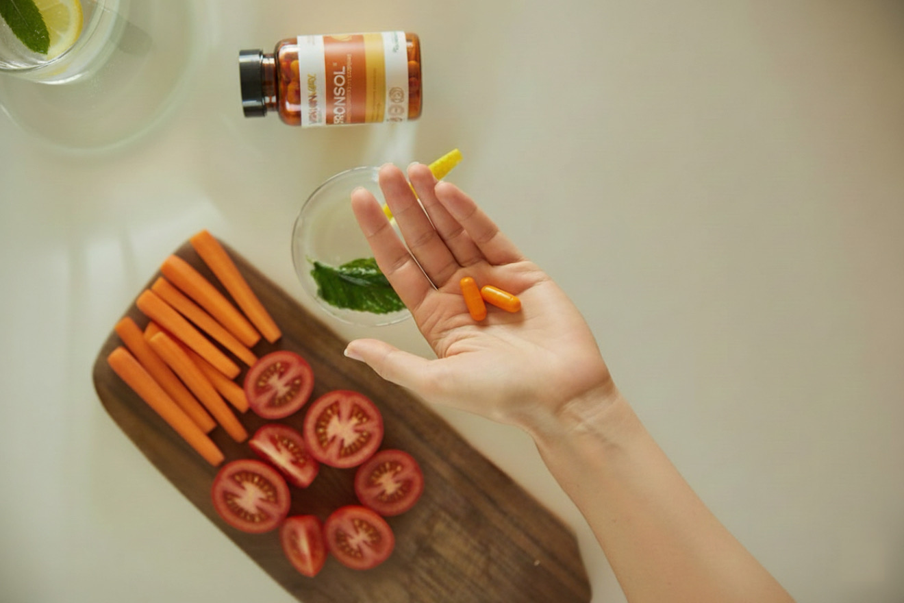 BRONSOL combina betacaroteno + licopeno y vitaminas antioxidantes para favorecer una pigmentación saludable y ayudar a proteger las células frente al daño oxidativo ocasionado por el sol.
